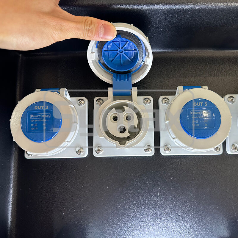 | Circuito de salida 2 | 4 × 3P 16A 220V IP44 enchufes montados en panel, protegidos por 4 × 1P+N 16A 30mA RCBOs |