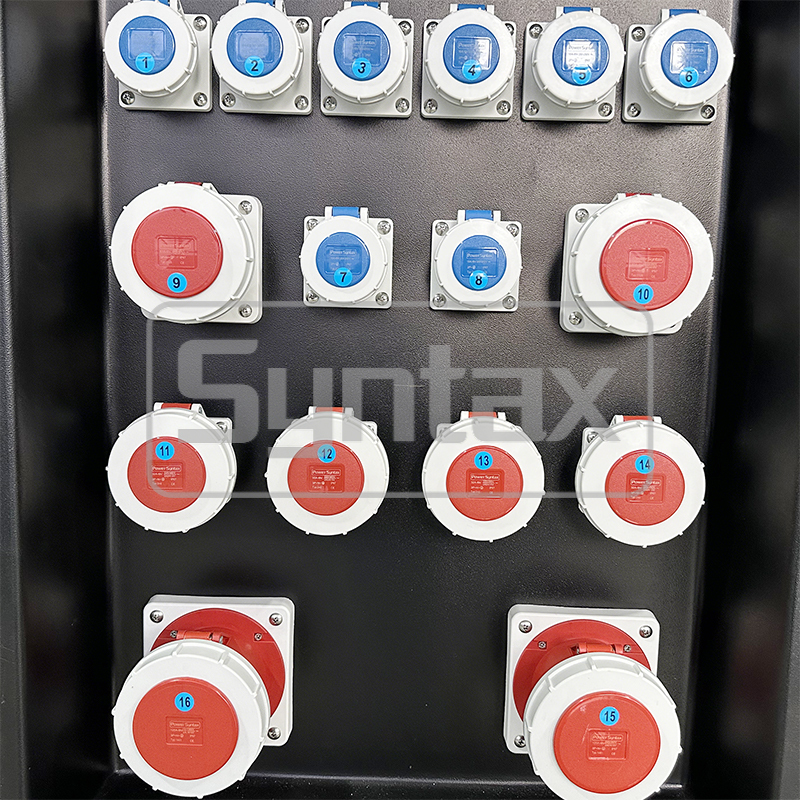 | 1 de salida | 2 × 5P 125A 400V enchufes montados en panel IP67, protegidos por 2 × 4P 125A 30mA RCBOs |